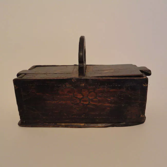 Recipinete metálico con asa en forma de arco con un gancho en el centro. Tapa de color bronce con forma de ave.