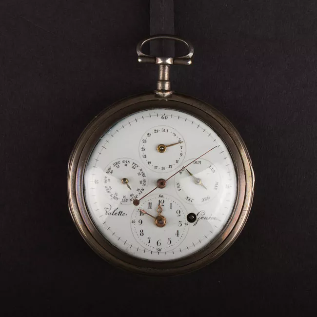 reloj calendario con tres cajas, una de ellas realizada en carey pinta...