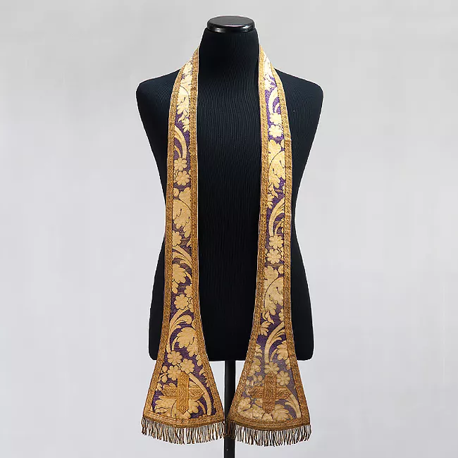 Banda confeccionada en tela morada con diseño vegetal dorado, tejido. ...