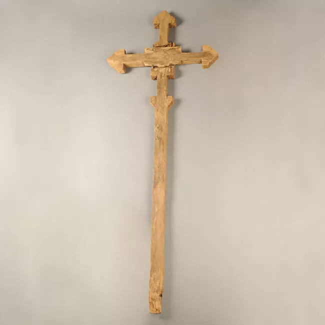 Vestimenta liturgica, confecionada en tela blanca con bordados en hilo dorado. Formada por dos piezas unidas en los hombros, delantero periforme, más pequeño que la espalda, ésta va en corte recto y rebaje de escote en V. Ambas piezas presentan decoración bordada en diseño vegetal menudo y roleos; la espalda tiene un pequeño escudo con un perro al centro. Interior, forrado tela amarilla.