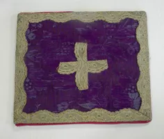 Textil negro damasco y seda cosido y aplicaciones de galón plateado. Vestimenta alargada de tela negra, tejido en diseño de figuras vegetales sobre relieve. Pieza delantera, periforme, tiene dos franjas longitudinales en cinta plateada que forman un rectángulo y también al borde. Espalda, la misma cinta plateada forma una gran cruz. Interior, tela negra.