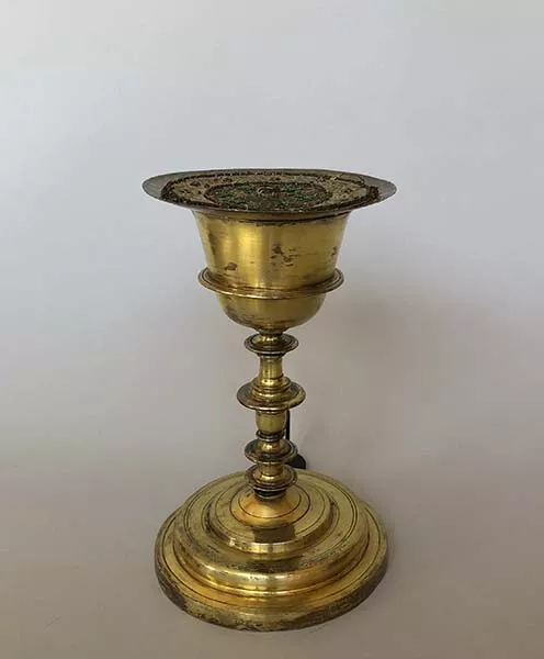 Copa de fuste alto y gran base circular se superficie bronceada. El va...