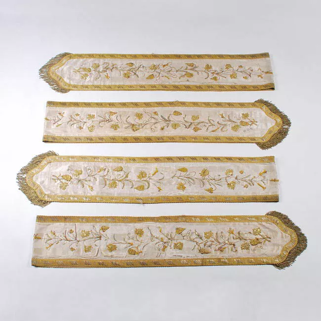 Objeto utilitario. Paño blanco con aplicaciones bordadas de diseño vegetal con hilo dorado, presenta florecos en su parte inferior.