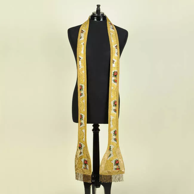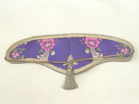 Textil cosido de brocado color rojo anaranjado, azul, verde, amarillo. Aplicación de galón dorado, forro ocre. Banda de tela roja con conjuntos de grandes flores tejidas. Extremos inferiores, trapezoidales marcados por una cinta metálica, dorada. Interior, forrado en tela ocre.