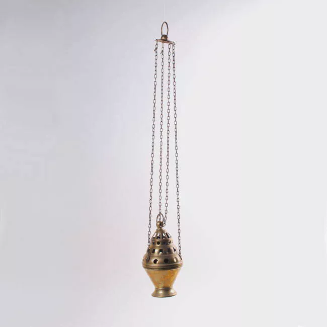 Textil de seda cosido de color amarillo con bordados en relieve en hilo de oro y otros en colores de seda, cordón trenzado del mismo color y borla amarilla, aplicación de galón dorado, adición de mostacillas y lentejuelas metálicas doradas y piedras. Forro algodón blanco. Prenda litúrgica de uso exterior de forma rectangular cortada en curva, los extremos laterales redondeados y el inferior con una prolongación central. De los lados pende un cordón, unido al centro por una borla dorada. De color amarillo/dorado. Decoración central bordada con diseño vegetal, flor roja, roleos y una flor de lis. Reverso forrado en tela blanca. Corresponde a un cuello rígido que se superpone en los hombros alrededor del cuello.