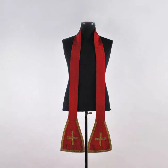 Banda de tela roja, estrecha y los extremos inferiores en forma trapez...
