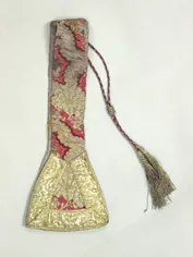 Textil de seda rojo cosido con bordado en relieve de hilo de oro, galón enjuncado y flecos hilos dorados. Aplicación de lentejuelas y cuentas negras facetadas. Textil rectangular de color rojo, extremo superior de corte recto e inferior irregular con dos puntas con flecos. presenta en todo el contorno un cinto dorado rodeado de un bordado de carácter vegetal. En su centro se presenta un corazón con rayos y una inscripción. Por otro lado tenemos un bordado vegetal con un centro que presenta un cáliz con rayos, animales y motivos naturales.