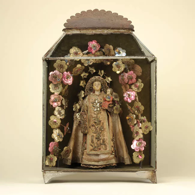 Objeto rectangular de vidrio y latón en cuyo interior hay una figura f...