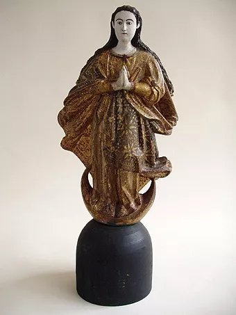 Figura de devoción cristiana, es una representación femenina de pie. Al extremo superior presenta la cabeza cubierta y el rostro es oval, pálido y desdibujado; tiene los brazos junto al torso y antebrazos a la altura de la cintura; carece de manos, en su lugar tiene orificios profundos. La vestimenta envuelve su cuerpo, es una túnica roja con escote marcado por unas breves esferas y manto celeste que cubre la cabeza hasta la base. El reverso de esta imagen presenta un fuerte relieve de talla longitudinal.