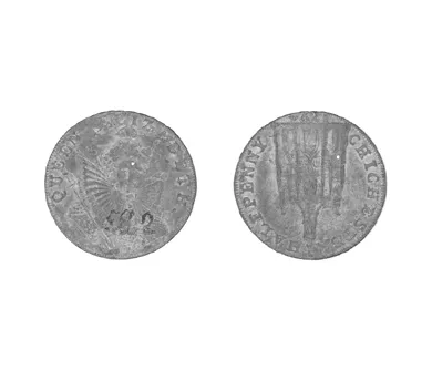 Objeto metálico de formato circular. En el anverso aparece un escudo c...