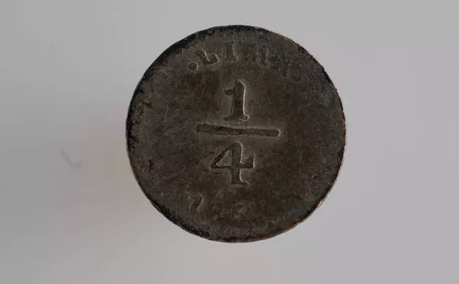 Moneda de metal de formato circular. En el anverso se lee LIMA 1/4 . E...