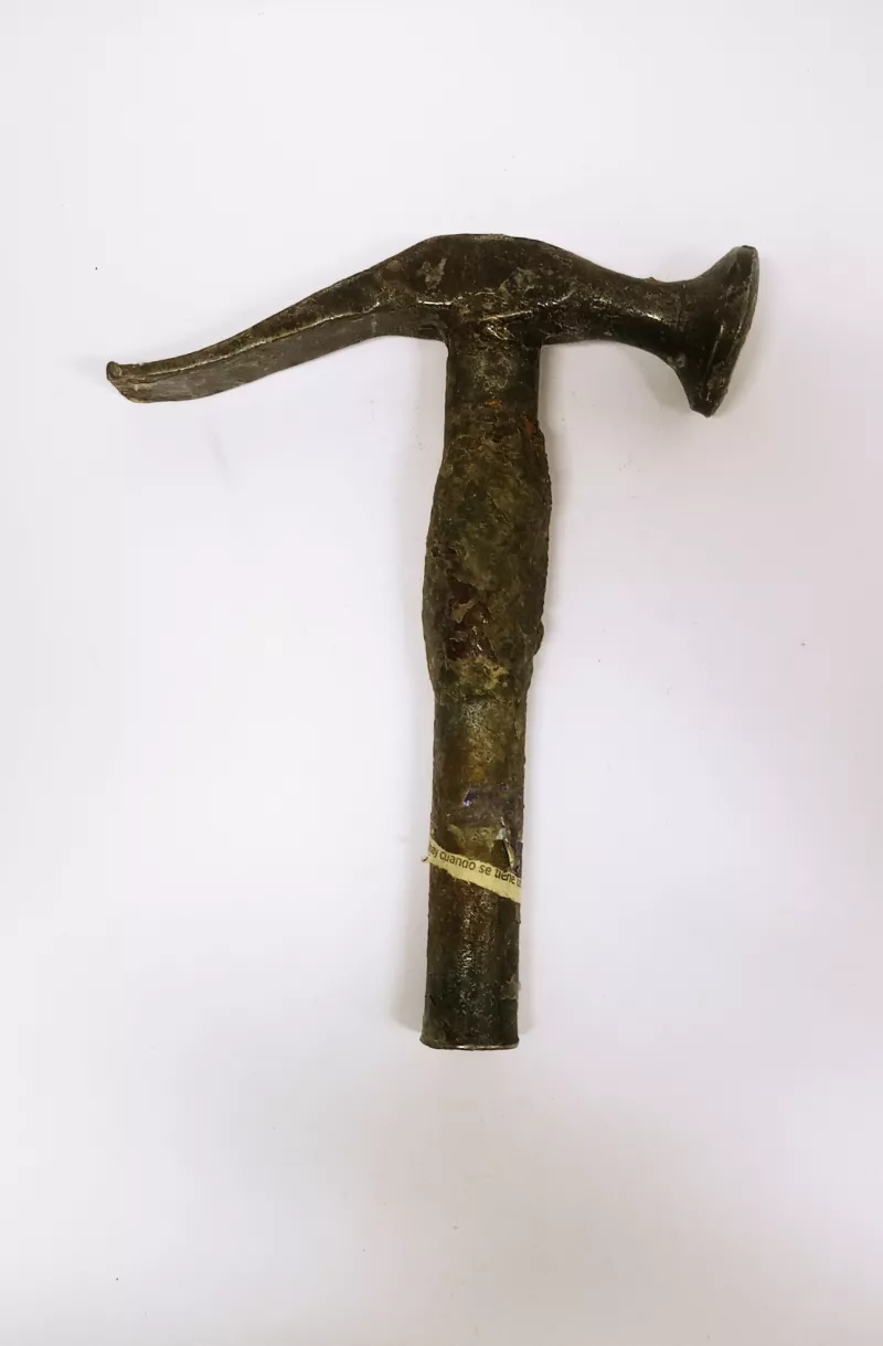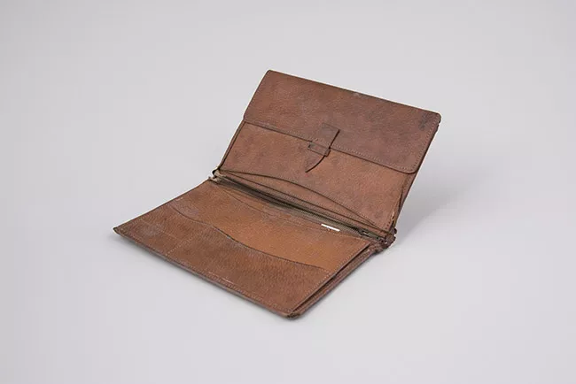 Objeto de vidirio con metal. Tiene un estuche de cuero, con letras doradas. Los lentes están unidos por un puente de metal y en uno de los vidrios tiene un pequeño mango.