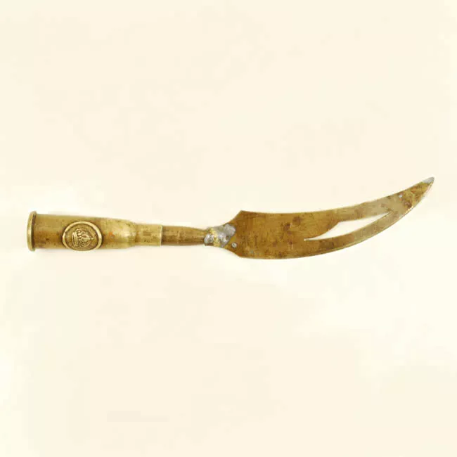 Objeto metálico de forma triangular, decorado por un lado con líneas, cruces y rombos incisos. En la parte superior tiene un pequeño eje central. Objeto usado para sostener el estribo.
