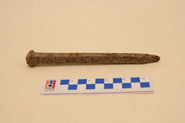 Dos clavos de fierro forjado, cuerpo de sección cuadrada con punta en ...