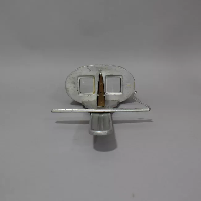 Objeto utilitario, que sirve como sistema de iluminación. Pieza de forma rectangular, de color oscuro, su cara superior funciona como tapa y a ambos costados posee sistema de sujeción. De la parte superior sale un cable que se encuentra unido a una lámpara de volumen circular con perilla giratoria y clip de sujeción para unirla al casco.