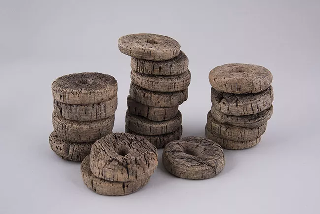 Objeto para sostener sombreros, de forma cilíndrica y de madera clara....