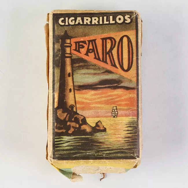 Cajetilla de cigarrillos rectangular, rotulada ‘Cigarrillos Faro’, con...