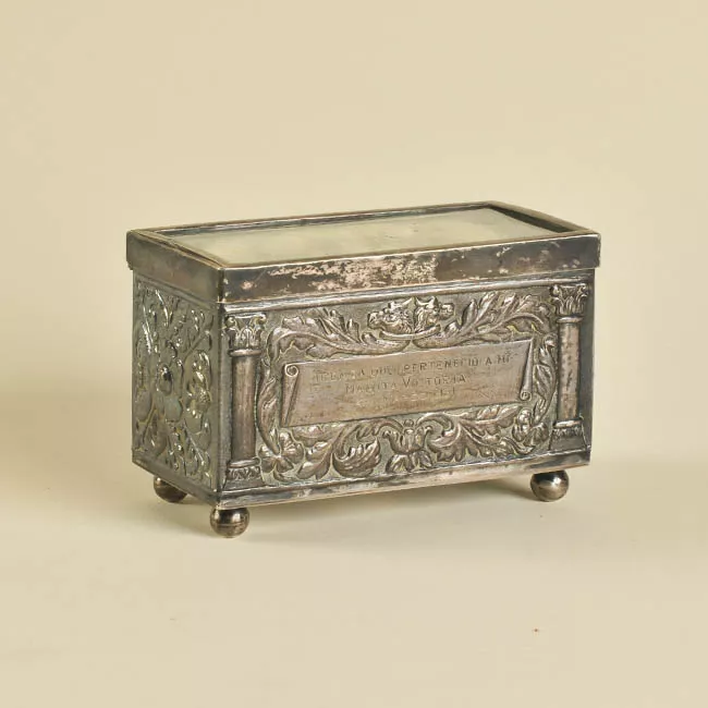 Objeto de dos cuerpos metálicos apilados verticalmente, ambos con superficie plateada. El inferior es más ancho y redondeado; el superior, cilíndrico, tiene tapa con pico corto y ambos poseen mangos negros angulares.