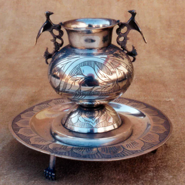 Objeto de uso doméstico, utilizado para proveer privacidad. Compuesto por un bastidor de bronce y pantalla de tela. En la parte inferior lleva una lámina de bronce trabajado en relieve y dos patas terminadas en esfera.