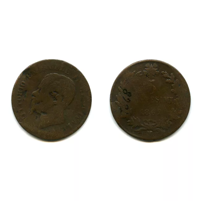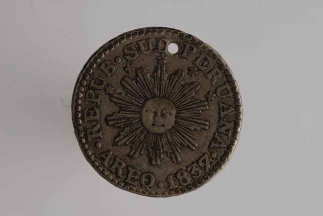 Objeto metálico de forma circular de bordes irregulares, con dos caras...
