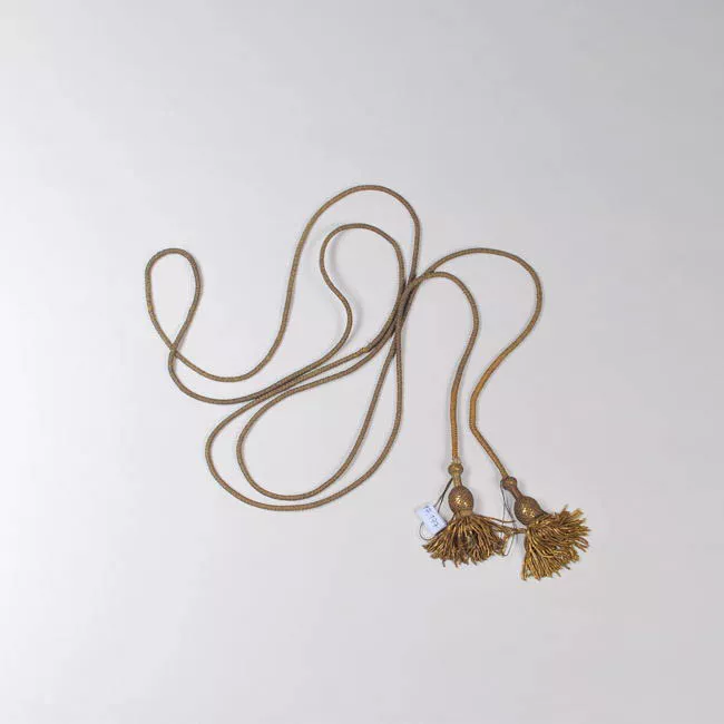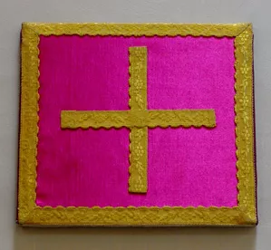 Figura femenina, elaborada en una sola pieza de talla completa, está en una posición semi inclinada; de pelo largo color café oscuro, con los brazos flectados hacia adentro, con las palmas juntas y pegadas al pecho. El rostro; nariz puntiaguda y recta, con ojos de color cafés mirando hacia adelante. Por su parte trasera vemos surcos verticales en bajorrelieve de color negro. Esta figura posee una vestimenta con diseños florales, líneas y puntos, todos de color dorado (técnica de plata corlada y estofado). En los puños tiene franjas de color rojo. En la parte inferior tiene una media luna invertida, posiblemente representa la asunción. La imagen se encuentra sobre una base medio circulo de color negro.