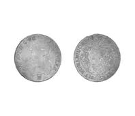 Objeto metálico de formato circular. En el anverso aparece un castillo...