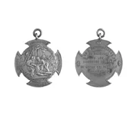 Medalla en forma de cruz paté, tiene un circulo central y en los extre...