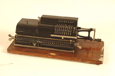 Maquina de sumar de fierro de color negro, con los números en blanco, ...