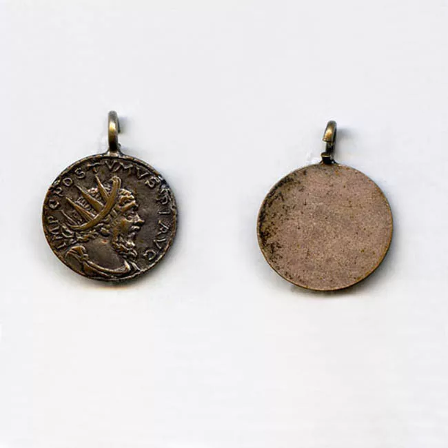 Moneda circular en cuya cara aparece una figura masculina de busto y p...