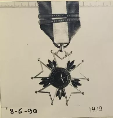 Objeto de metal esmaltado con forma de cruz de malta, y cinta blanca y...