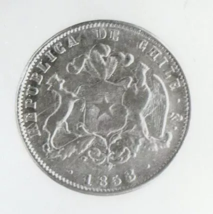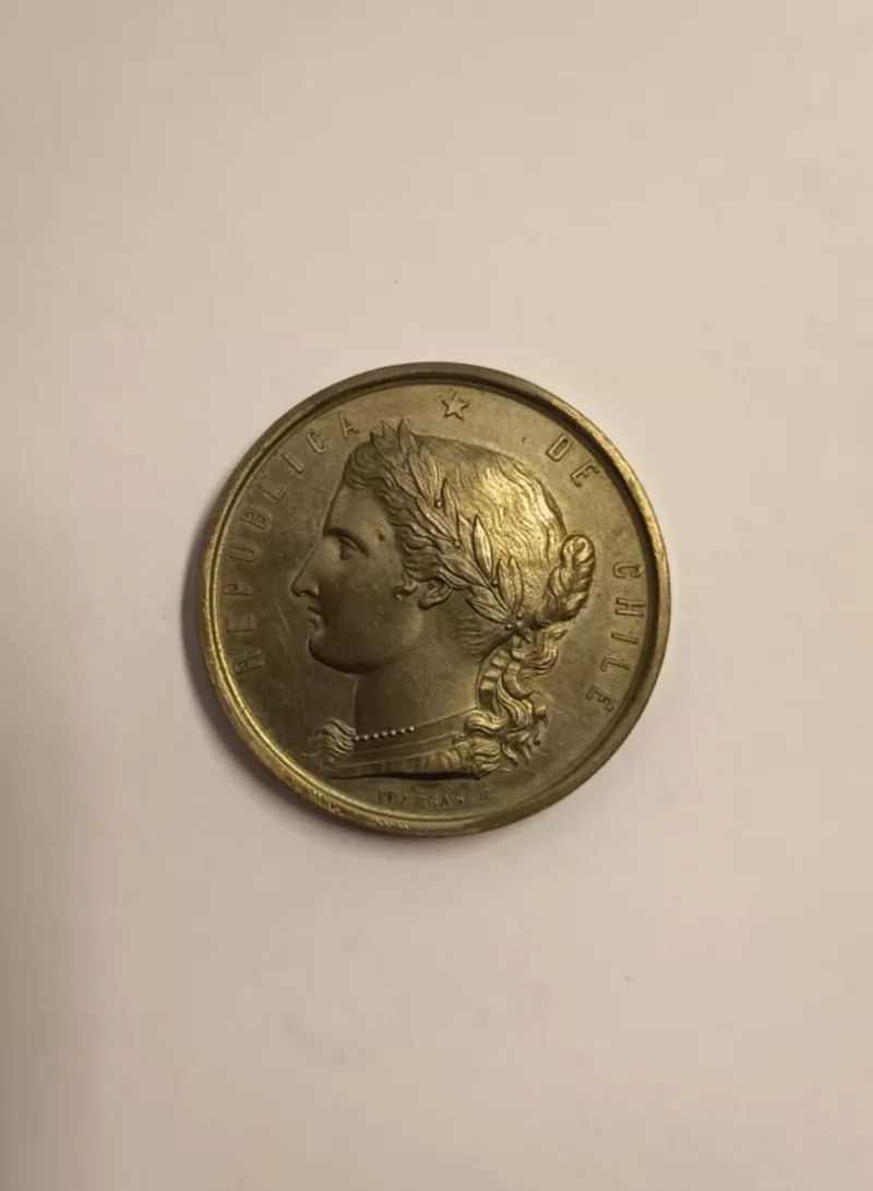 Moneda circular en cuya cara aparece la figura de un cóndor con las alas semi desplegadas junto a un escudo de borde estrellado. En el sello una corona de hojas de laurel rodeando las palabras " un décimo".