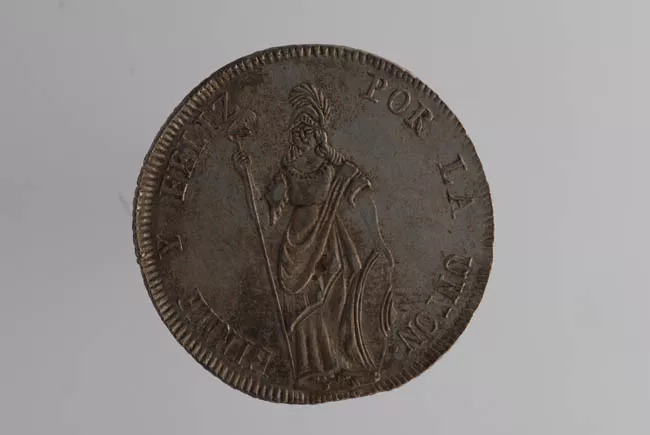 Moneda circular en cuya cara aparece una corona de laureles que enmarc...