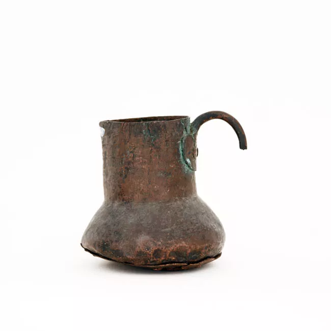 Enlozado, blanco, cuerpo globular con asa y ornamentado con diseño naturalista de color celeste, cuello estrecho y boca ancha; base circular ondulado