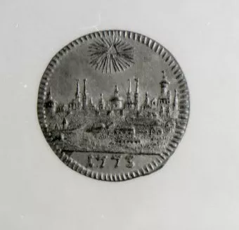 Objeto de formato circular, metálico, en ambas caras presenta relieves...