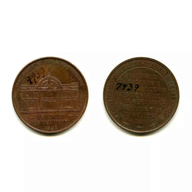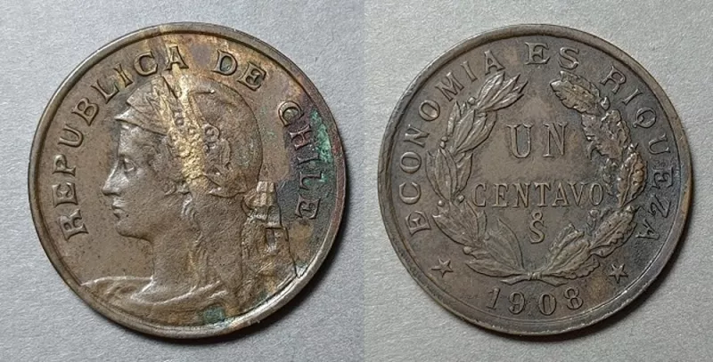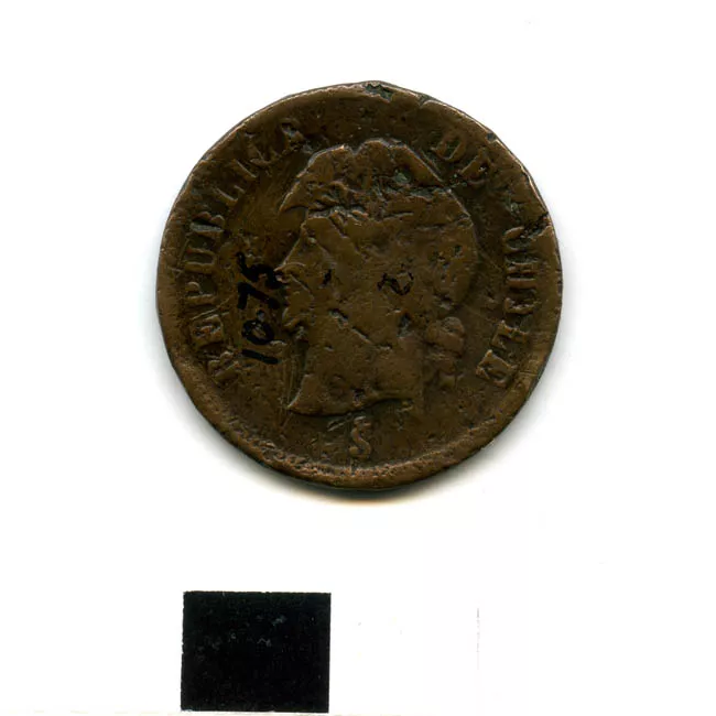 Moneda circular en que aparece cabeza femenina de perfil a la izquierd...