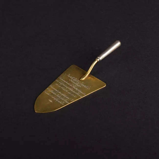 Objeto conmemorativo elaborado en metal dorado. Lámina de forma triang...