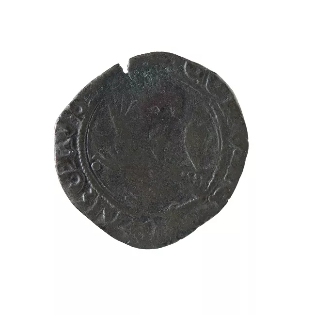 Objeto metálico de forma circular y bordes irregulares, color plateado...