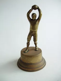 Trofeo de base circular, con un pilar bajo que sostiene una figura h...