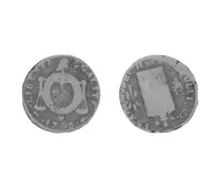 Objeto metálico de forma circular, de bordes irregulares. Por el anverso aparece un busto masculino de perfil hacia la derecha, representación del emperador Constantino II el joven, con corona de laureles y leyenda circundante. Por el reverso representa una especie de edificio, una puerta de un campamento pretoriano, con dos esferas y un astro en la parte superior.