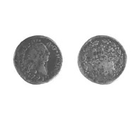Objeto metálico de forma circular. Por el anverso aparece un busto masculino de perfil hacia la derecha, representación del emperador Constantino II el joven, con corona de laurel y leyenda circundante. Por el reverso representa una especie de edificio, una puerta de un campamento pretoriano, con dos esferas y un astro en la parte superior.