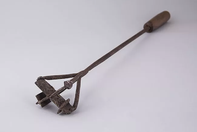 Herramienta para taladrar manualmente. Objeto de metal y madera, se compone por una estructura cilíndrica de metal. En la parte inferior una broca salomónica o espiral, la parte central forma un rectangular con un tomador de madera esférico en el centro, en la parte superior un pomo de madera torneada.