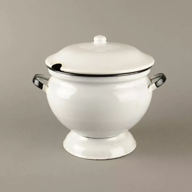Letrero de metal enlozado de forma rectangular y disposición vertical. En la parte frontal, sobre un fondo blanco, tiene un reloj dispuesto transversalmente, en la parte superior e inferior textos textos en negro.