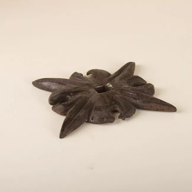 Pieza metálica de forma irregular. Orificio cuadrangular central. Figu...