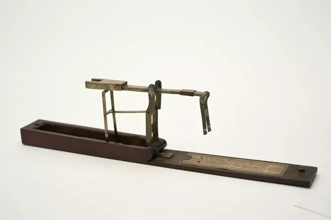 Objeto de forma irregular compuesto por dos partes: una hoja de metal y una cacha de plástico negro. Esta última tiene dos remaches en su parte central y en la parte inferior.