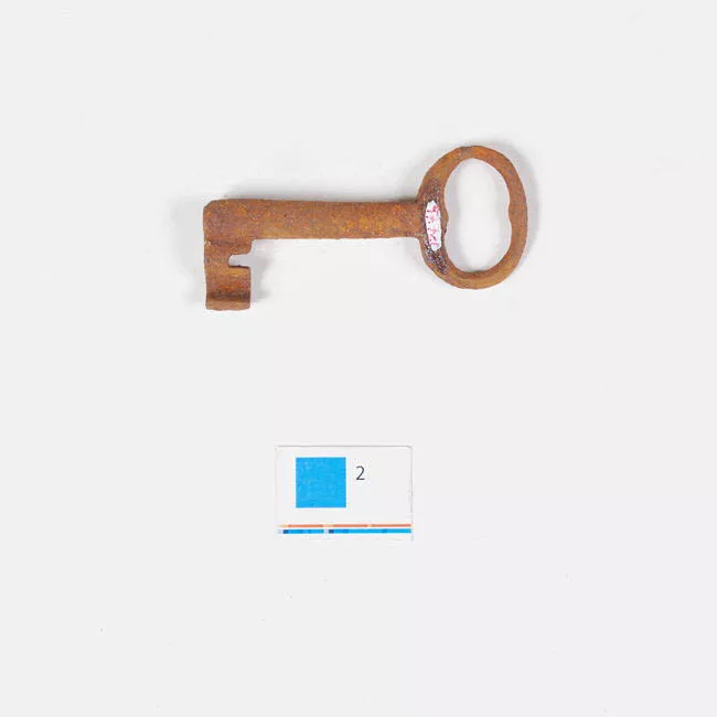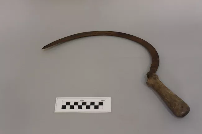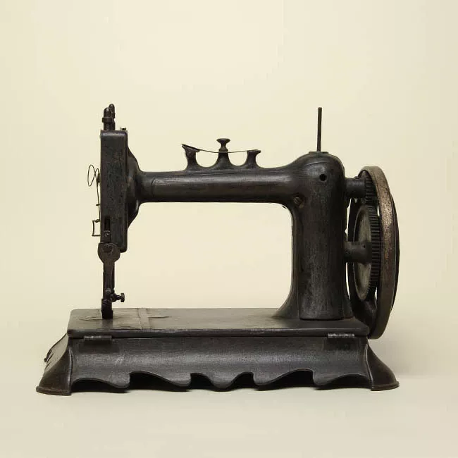 Objeto de fierro pintado negro, utilizado para coser textiles. Su meca...