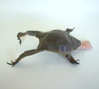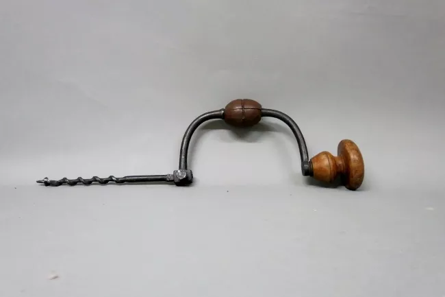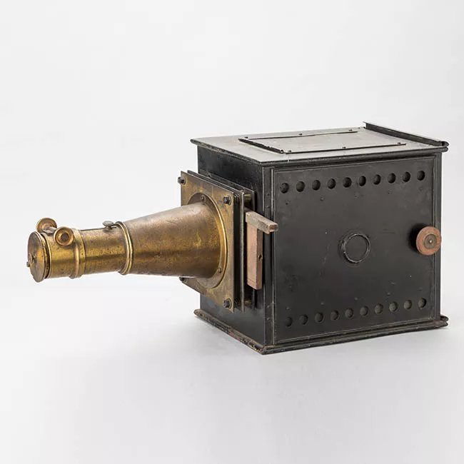 Objeto rectangular de metal negro, con un brazo de bronce con un lente...