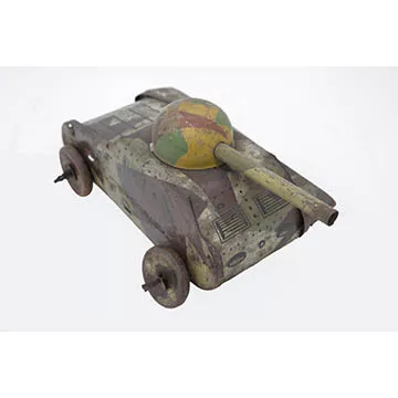 Figura zoomorfa que representa un pato con cuerpo plano visto de perfil. El cuerpo tiene plumas rojas, pico y alas anaranjadas, cola levantada y está colocado sobre una base rectangular con pequeñas ruedas.