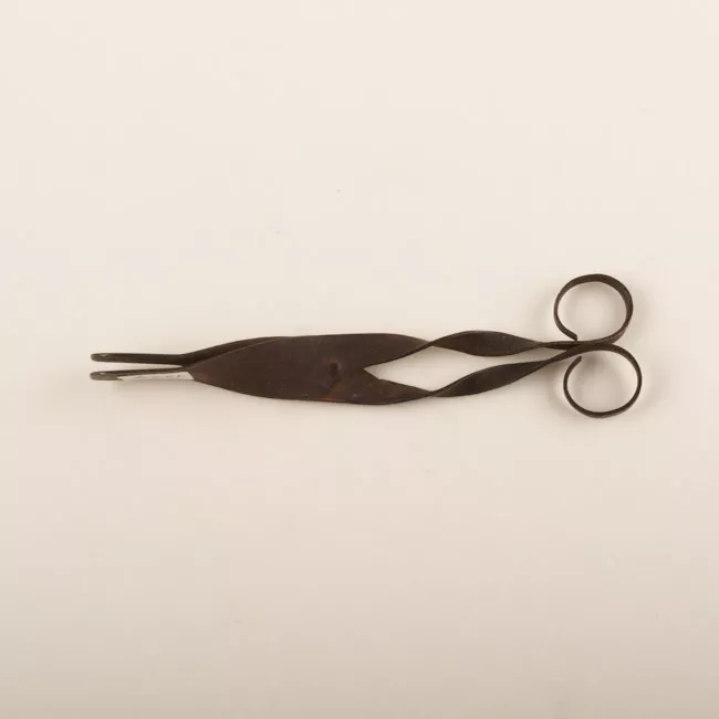 Objeto utilitario. Lamina de metal torcida de forma alargada que termi...