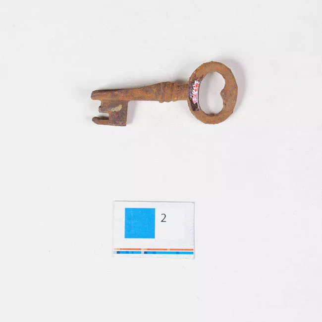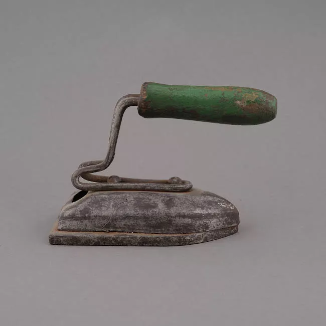 Objeto de uso doméstico. Pieza metálica dorada formada por aro triangular decorado con equis sobre el que se dispone una figura masculina de cuerpo entero y de pie vestida con chaqueta, corbata y sombrero.