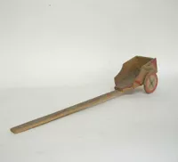Objeto recreativo. Contenedor rectangular con tapa elaborado en cartón forrado en papel rojo y en tela de fondo verde y detalles en rojo, celeste, azul y rosado. En la parte central de la tapa, inscripciones en papel adherido. En su interior fichas rectangulares elaboradas en madera con inscripciones incisas en verde, azul y rojo. En un compartimento más pequeño, piezas oblongas de marfil con puntos incisos en rojo y en azul. Junto a ellas, dos fichas circulares plásticas de color verde.